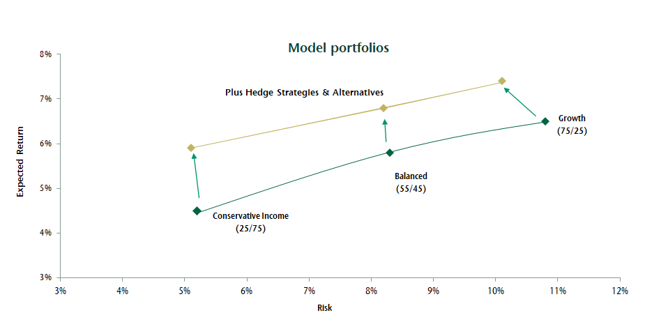 What this means is that including alternative asset classes, such as commercial real estate, infrastructure or private loans, in the stocks-and-bonds portfolio of a client with a medium level risk tolerance can help do one of two things: either reduce the portfolio’s risk without giving up overall expected returns or increase the portfolio’s potential for growth while maintaining the same level of risk. Which of the two outcomes prevails generally depends on the characteristics of the portfolio and asset classes chosen.