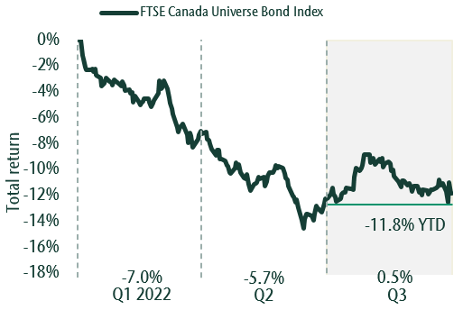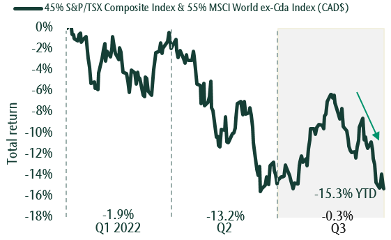 After a challenging start to the year, market volatility continued in the third quarter. The summer started with a rally in stocks as inflation declined from peak levels. With peak inflation likely behind us there was a possibility that central banks would soften their aggressive interest rate hikes. However, the rebound in equities was short lived as central banks reaffirmed their commitment to fighting inflation. While higher rates are necessary to create a better balance between inflation and growth, this dynamic increases the risk of a recession and further declines in markets.