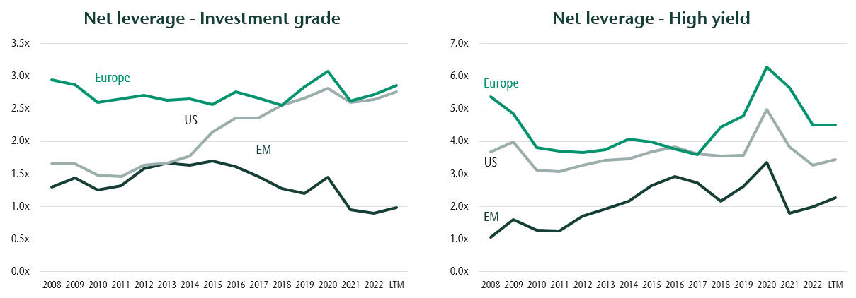 Many corporate credit issuers in Emerging Markets are resilient and high-quality companies. For example, they are often less leveraged than their comparably rated developed-market counterparts: over time, Emerging Markets investment-grade companies have