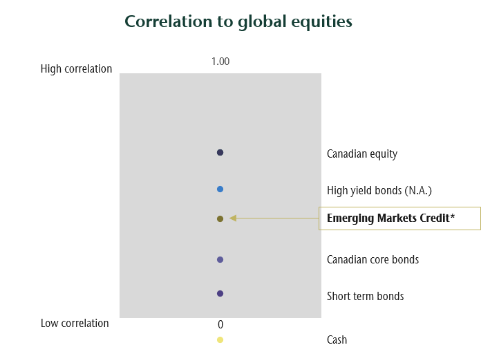 An allocation to Emerging Market Credit in clients' portfolios—replacing some of a portfolio's allocation to North American high-yield bonds—adds diversification since Emerging Market Credit has a lower correlation to global equities than US and Canadian high-yield credit.