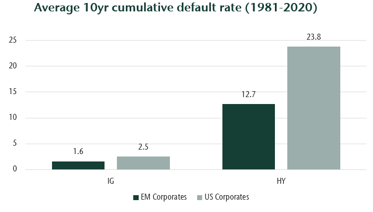 Given this structural setup, it may not be a surprise that Emerging Markets high-yield companies default at roughly half the rate of US high-yield issuers.