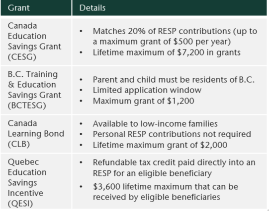 The RESP subscriber contributes, often yearly, up to a lifetime maximum of $50,000 per beneficiary, with “catch-up” payments available if you miss a few years. To further encourage education savings, the Canadian government offers financial incentives to eligible RESP subscribers. The following table summarizes key features of various grants available.