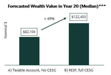 We have conservatively assumed all cashflows do not increase with inflation.*** Assuming both clients invest in a CC&L Balanced Growth portfolio, we expect Client B to accumulate 49% more wealth by year 20, purely due to tax-free growth and CESG income.*** If Client B qualified for additional grants such as the BCTESG, this difference would be even larger.